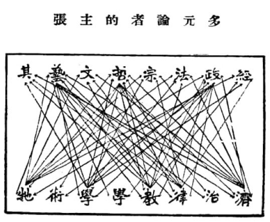 这一段话在一方面表明上层建筑物如政治,法律,宗教,哲学,文学,学术等等对于历史的争斗的经过都有影响,在另一方面表明经济的基础是决定一切的最后的要素。例如上面所举英国一八二五年取消欺诈条例使商业与运输发生革命,虽为政治影响经济的明证,然没有十八世纪下半期的经济革命,使大规模的企业成为当务之急,即不会有取消这种条例的事实出现。所以经济成为“决定一切最后的要素”,是确切不移的。在唯物史观论者与多元论者间有一个根本不同之点,今为使读者易于了解起见,特图解于下。