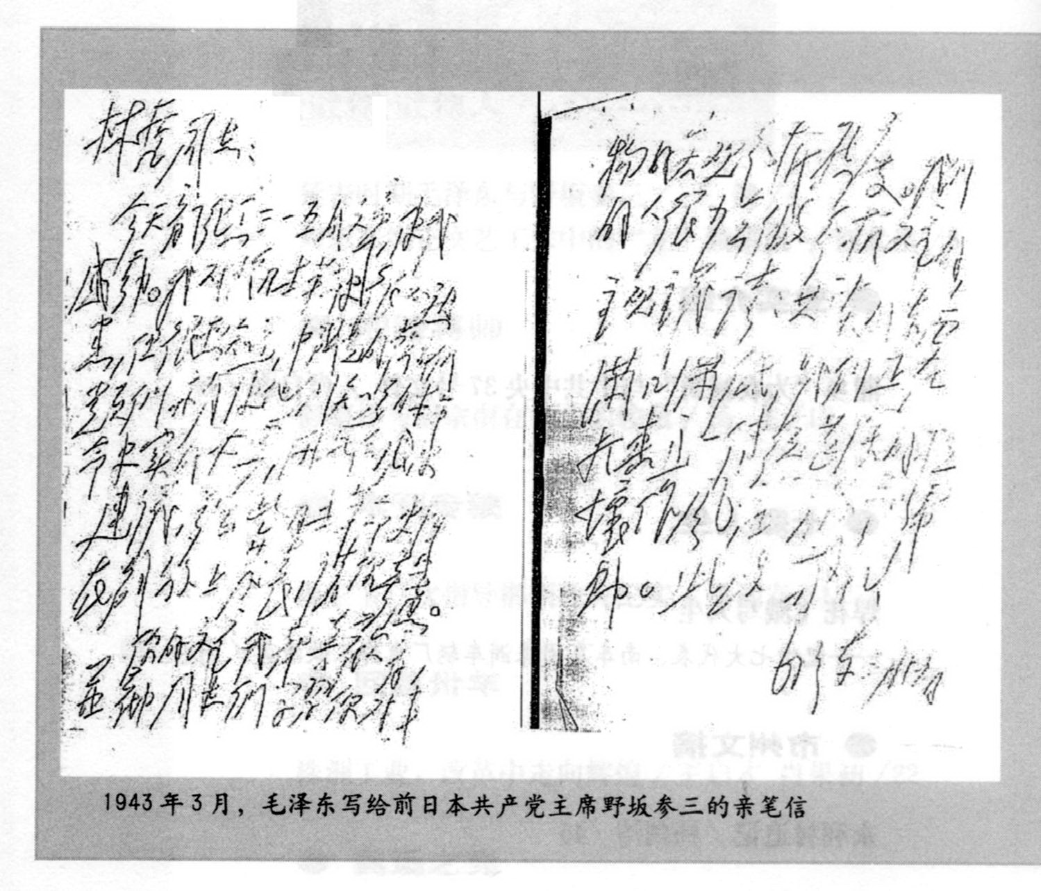 * 本文和《致野坂参三(一九四五年五月二十八日)》由日本一桥大学教授加藤哲郎二〇〇三年七月发现于日共中央资料室女资料员水野津太生前保管的文献资料(即上野先川上村社会运动资料中心由井格保管的“水野津太资料”)中。现据王健《延安时期毛泽东与野坂参三》(《湘源》二〇〇八年第三期,以下简称《延安》)中的文字本,并参照信件手稿照片整理出本文。