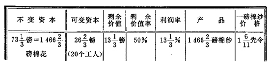 | 不变资本 | 可变资本 | 剩余价值 | 剩余价值率 | 利润率 | 产 品 | 一磅棉纱价格 | |