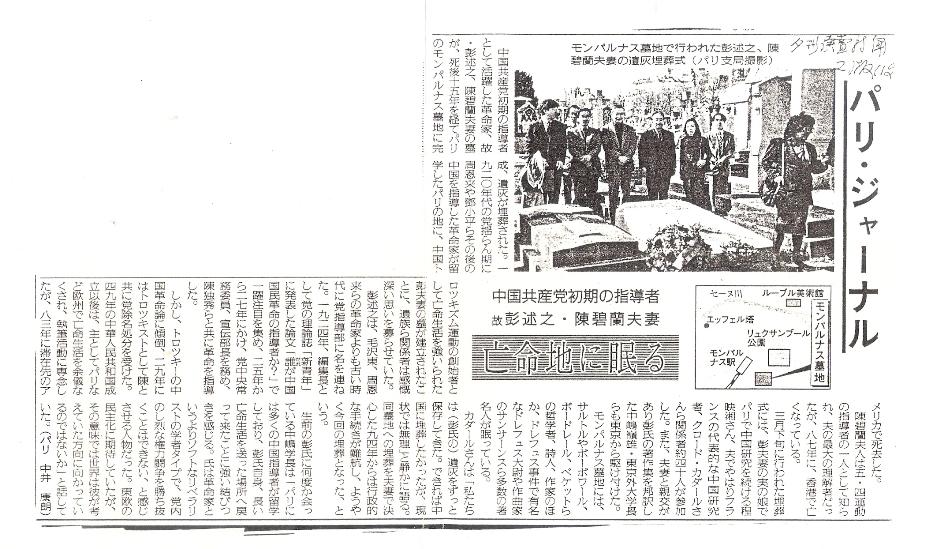 | 中文马克思主义文库 -> 彭述之 相关链接:陈碧兰 中国共产党早期的领导者已故的彭述之陈碧兰夫妻长眠于流亡地 1998年4月21日 ![]() 作为中国共产党早期领导人而活跃的革命家——已故的彭述之、陈碧兰夫妻——之墓终于在其逝世十五年之后于蒙那帕斯墓园建成,其骨灰被安置于内。与死者有关系的亲人等感慨:之后领导中国革命的周恩来和邓小平在一九二○年代党飘摇不定的那个时代来的就是巴黎,而作为中国托洛茨基主义运动的创始人、被迫亡命的彭氏夫妻的墓居然也建在这里。 彭述之在比毛泽东、周恩来等革命家更早的时候,就在党中央内占有一席之地了。1924年,他作为主编在党的理论刊物《新青年》上发表了论文《谁是中国国民革命的指导者?》,并以此立刻获得瞩目,自1925至1927年担任党中央常务委员、宣传部部长,与陈独秀等人共同领导了中国革命。 但是,因为他完全倾向于托洛茨基的中国革命论,1929年他作为托派与陈独秀共同被中共开除党籍了。1949年中华人民共和国成立后,他不得不过起了亡命他乡(主要是欧洲的巴黎等地)、专门写作的生活,最后在1983年死于流亡地美国。 他的妻子陈碧兰作为五四运动的领导者之一被人所知,同时她也是她丈夫最大的理解者,但她也于1987年在香港去世。 一直在巴黎作中国研究的彭夫妻的亲女儿程映湘,与其丈夫、法国著名的中国研究者克劳德等亲朋好友约40人参加了在三月下旬举行的葬礼。此外,与他们有深交并将彭氏著作翻译为日语的东京外国语大学的校长中嶋岭雄也从东京赶来。 蒙那帕斯墓园中长眠着沙特、西蒙.波伏娃、波特莱尔、贝克特等哲学家、诗人、作家,还有因德雷福斯事件而出名的屈里弗斯、作曲家卡米尔•圣-桑等许多著名人物。 克劳德静静地说:“我们一直保存着(彭氏)的骨灰。如果可能的话本想在中国埋葬,但是现在的情况不允许。”他还说自从94年决定将他们共葬之后,行政手续一直没办好,所以一直拖到现在。 与生前的彭氏数次会面过的中嶋校长说:“许多中国革命的领导者都在巴黎留学过,而彭氏自己也终于被葬在他长时间流亡生活过的这个地方,我觉得这其中真的很有联系啊。他比起革命家,更像是柔性的自由主义的学者式人物,因此让人觉得他无法在党内激烈的权力斗争中获胜。虽然他未及见到一直期待的东欧的民主化,但是从某种程度上世界正在向他所设想过的那个方向发展着,不是吗?” (巴黎 中井康明) |