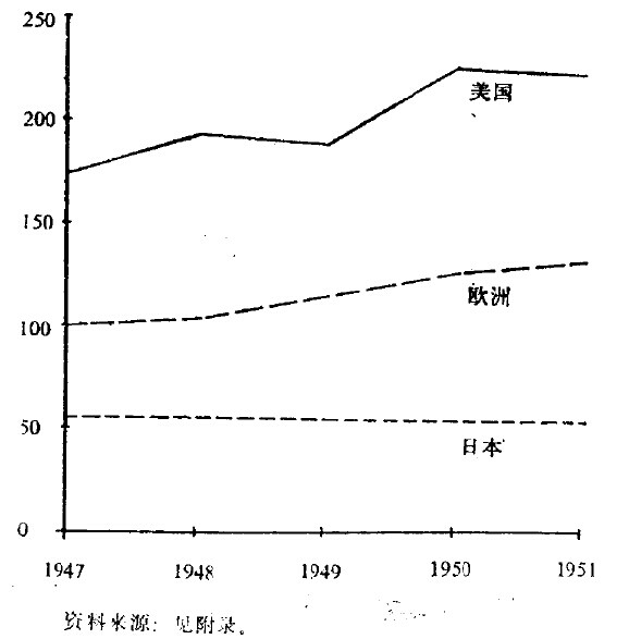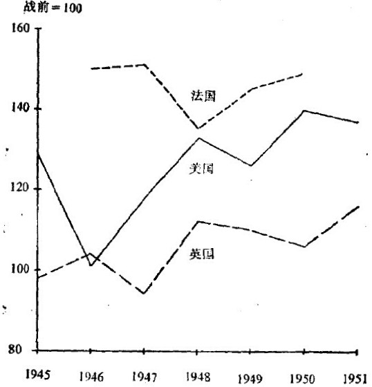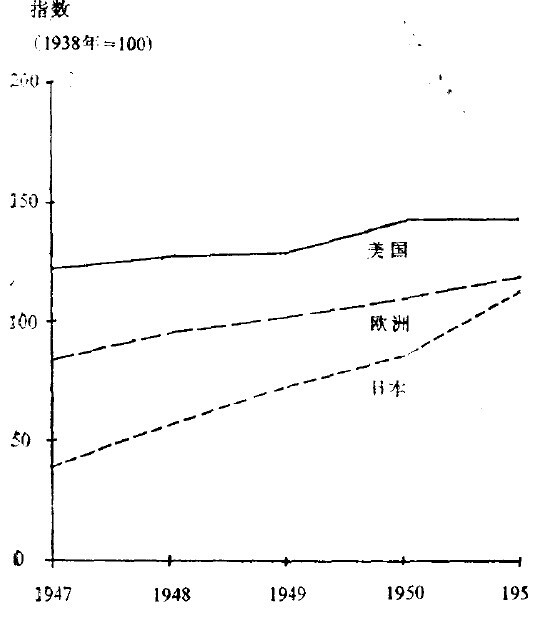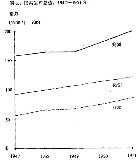 无论是欧洲,或是日本,发展都远不如美国快。1951年美国生产是1938年的2倍,而欧洲的产量仅增长了五分之一。1950年美国的积累率可与法国、日本和德国相比,比英国和意大利高得多。还没有一个国家能“赶上”美国。