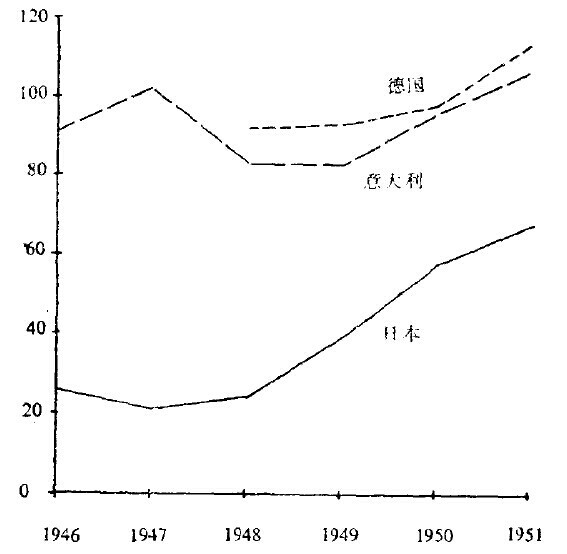 1947年后的几年内,除德国外,扩展的速度没有明显的加快。欧洲总产量每年稳定增长7%左右,工业生产增长10%左右(图6.1)。一直到朝鲜战争前,日本没有找到一种动力以避免1947年开始出现的停滞(见第7章)。1951年产量仍比战前低得多。