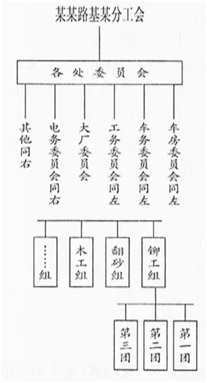 5、在同一上层工作部分有二个相连以上之小组,经上级工会机关之允许,便可成立各处委员会(如车务委员会、大厂委员会、车房委员会、电务委员会、工务委员会等)。