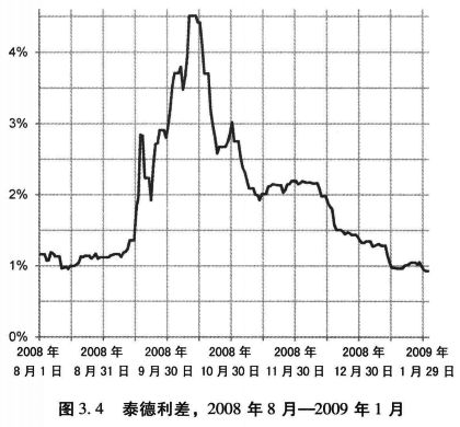 这些事件导致泰德利差蹿升到2.85个百分点。在接下来的一个短暂的下降之后,到9月29日再次上升到2.80点。在那一天,国会驳回了TARP纾困方案。显然,作为对这一事件的回应,泰德利差再一次快速上升,甚至到国会改变主意并于10月3日通过了TARP的立法之后,泰德利差仍然在继续上升。到10月10日,泰德利差站上了4.51点。直到存在争议的TARP纾困方案的详细内容于10月14日公布之后,泰德利差才开始下降。