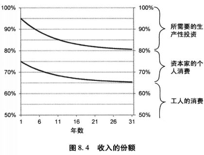接下来会发生什么?巴兰和斯威齐认为,工人消费对收入的份额随时间而下降,因此剩余上升,但是,被资本家个人消费所吸收的那部分剩余也随时间而下降。那么,让我们设想一下,被工人消费的收入份额从75%依次下降到74%,到73.1%,再到72.29%,如此等等;它每年都下降前一年降幅的9/10。最终的结果是工人的份额将永远下降,但并非没有界限。它将越来越接近总收入的65%,但绝不会低于,甚至不会达到这一下限(见图8.4)。(同样,如果你这周储蓄400美元,下周200美元,再下一周100美元,如此等等,你的总储蓄将永远增加,但并非没有界限。你的总储蓄将总是低于800美元。)设想资本家的个人消费也以相同的方式逐步下降,从收入的20%下降到19.5%,再到19.05%,如此等等。它将接近一个15%的下限。这样,与巴兰和斯威齐先前的论断一致,剩余将从收入的25%上升到一个上限,为100%-65%=35%,[14]同时资本家个人消费所吸收的剩余份额随时间从20%/25%=80%,下降到15%/35%=42.9%的下限。