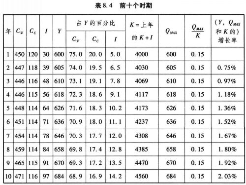 CW=工人的消费;CC=资本家的个人消费;I=净生产性投资;Y=实际产出=收入=总消费加投资支出;K=资本存量;QMAX=潜在产出。大部分数字四舍五入为整数。