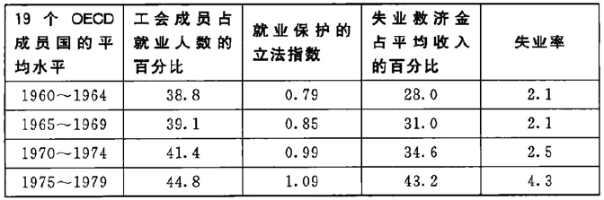 城市人口的急剧膨胀带来了工会主义的强势和通过立法支持工人的谈判地位的变革。表1.1给出了一些相关的指标,显示在一般的OECD成员国中,工人中的工会组织成员的比例有所增长。这种增长并不明显,因为服务业中的工人数量在增加,而服务业中的工人(除掉公共部门雇员中增长的那部分)比起工厂中的工人来说则趋向更少的联合。但是,伴随着长期的低失业率,工会组织日渐强大。表1.1还表明,与工资水平相比,失业救济金的水平在稳定增长,领取救济金的限制要求也变得更为宽松。失业的可能性不仅变得很低,而且对那些受失业影响的人来说,它所导致的收入损失也在变小。因此,不管条件怎么样,找第一份工作时面临的压力可能变得越来越小。正如OECD提供的数据所显示的那样,旨在限制雇主有关雇用和解雇权利的雇工保护法,在这一时期也得到了充实。工人们另一个显著的收益是平均工作时间的急剧减少,从20世纪50年代的大概年均2000个小时下降到1973年的1750个小时——相当于每个星期少工作大半天的时间[1]