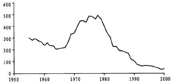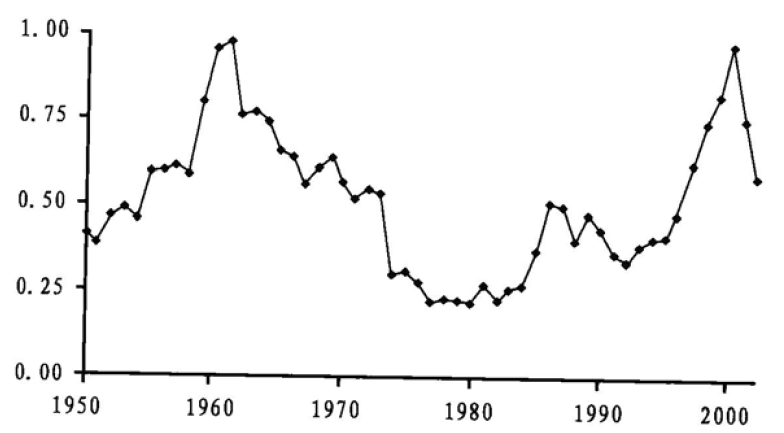 图1.1 每1000名产业工人的罢工天数(1953~2003)