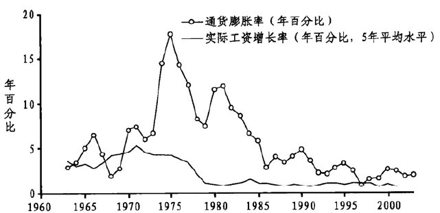 图1.2 通货膨胀率和实际工资增长率(1960~2003)