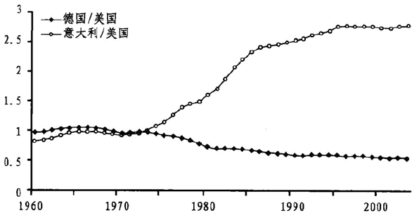 图1.5 德国、意大利居民消费价格与美国对比情况(1960~2003)