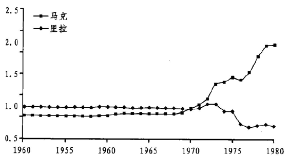 图1.6 马克、里拉与美元的汇率(1950~1980)