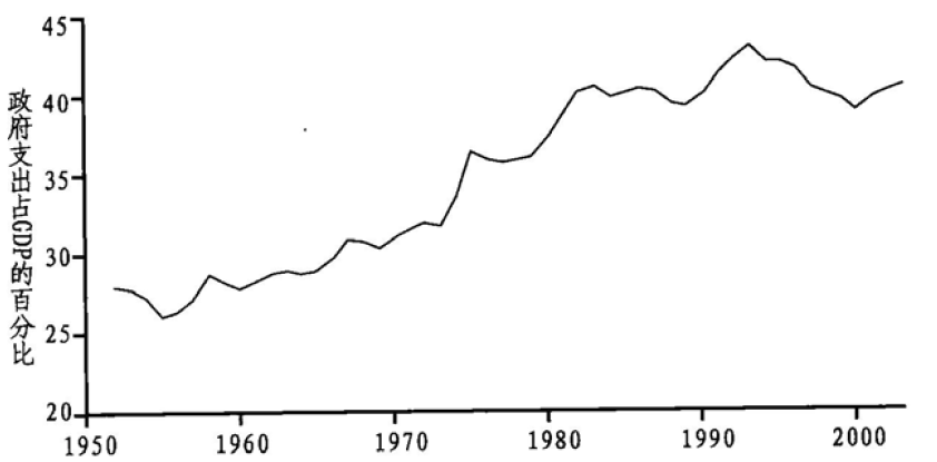 图1.8 OECD成员国的政府支出(1952~2003)