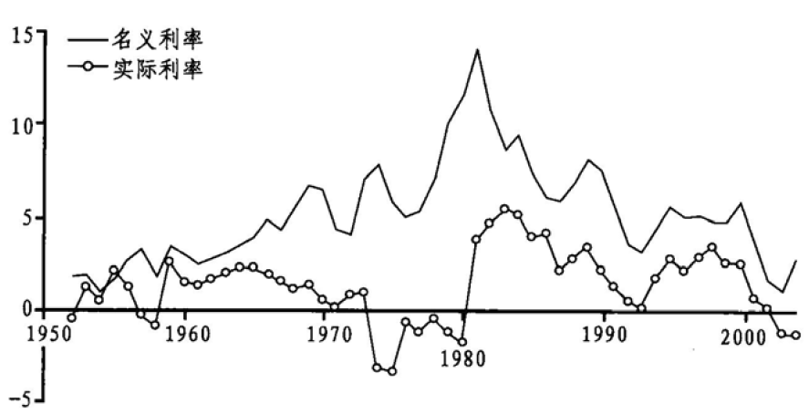 图2.2 美国的短期利率(1950~2004)