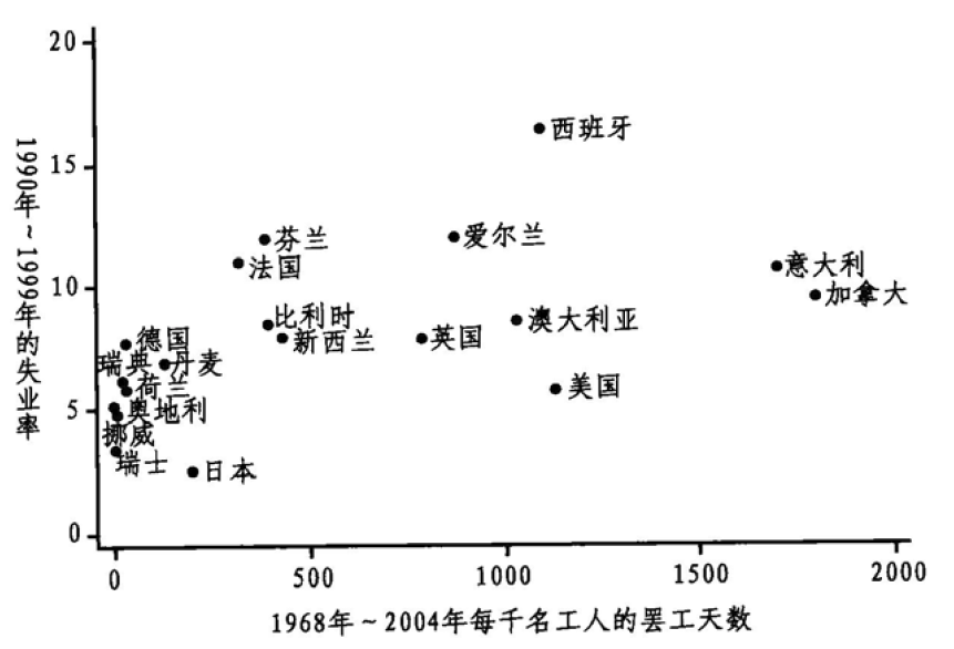 因其认为高失业率是不可避免的或者是自然的——按照米尔顿·弗里德曼的说法,“非加速通货膨胀性失业率”的概念常受到批判。然而,根据卡莱斯基的说法,这种观点实际上是马克思所说的变相“保留失业大军”的观点——在资本主义制度中,失业使工人工资得以保持在资本家的控制范围之内[1]。继而,失业可能被看作是对劳资冲突以及它所造成的各种经济不稳定——通货膨胀和利润下降——的反映,因为随着政府对储备采取限制性政策以及公众信心的下降,商业投资开始萎缩。这种解释与图2.4显示的失业模式相当一致。1990年~1999年的失业率与那些国家1968年~1979年间的罢工水平针锋相对(不仅包括工资激增,还包括工人们在通货膨胀率上升时保持生活水平的愿望)。尽管有外在的干涉事件(如,德国的统一)和不同国家间存在的种种差异(如,西班牙农业生产的大幅下降),但在1/4世纪之前,一个国家的失业率明显与它的劳资冲突的水平有关[2]。