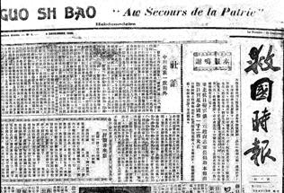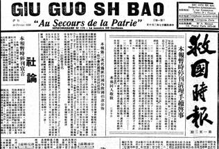 20世纪30年代中国共产党在国外创办的机关报。1935年12月9日在法国巴黎创刊。前身是这年5月15日在巴黎创刊的《救国报》。编辑部设在莫斯科,由共产国际中国共产党代表团领导。廖焕星、李立三、陈潭秋等先后任主编。印刷所和发行部设在巴黎,先后由吴玉章、吴克坚等负责。以海外华侨为主要对象。着重宣传中国共产党建立民族统一战线的政治主张,经常刊登中共国央主件(“国央主件”疑系“中央文件”之误——抄录者)和毛泽东、斯大林的著作,报道国内抗日救亡运动和抗日民主根据地的情况等。初为对开一张,周刊,后改为5日刊、3日刊。发行量初为5000份,后增至2万份。发行43个国家。在国内曾行销北平、上海、天津、武汉、西安等城市,在四川、新疆等地也有读者。1938年2月10日出至第152期后,迁到美国纽约与中国共产党领导的《先锋报》合并,仍以《救国时报》名称出版。后因工作人员回国参加抗日战争,宣布停刊。 ——载《中国近现代史大典》下册第651页。 (中国近现代史大典编委会编,中共党史出版社1992年6月第一版。) | |||||||||||||||||||||||||||||||||||||||||||||||||||||||||||||||||||||||||||||||||||||||||||||||||||||||||||||||||||||||||||||||||||||