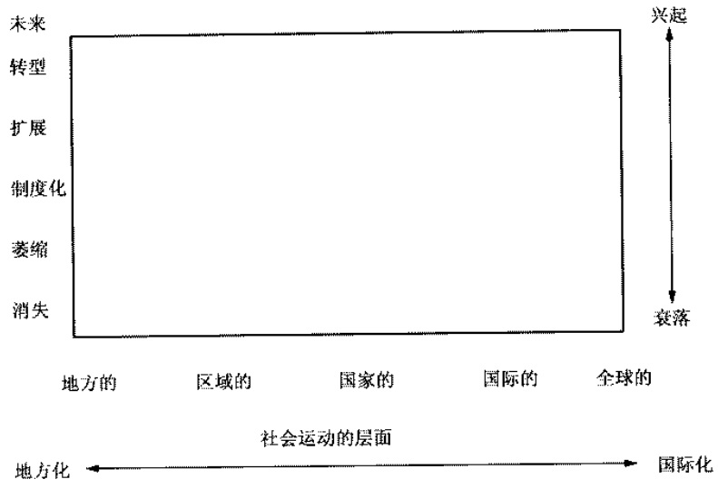 图7. 1中向右的箭头代表了广泛的国际化,它意味着地方、区域甚至可能国家层面的社会运动正逐步让位于国际层面和全球层面的社会运动。向左的箭头意味着超大范围的社会运动日薄西山,而新的地方主义可能兴起——目前看来,这一可能性不大。图中向上的箭头顶端,表示的是社会运动的普遍扩张和转型;箭头中间以上部分表示的是广泛的制度化:即社会运动在全世界的各个层面上展开,而主导社会运动的是非政府组织、专业化的社会运动企业家,以及与政权有着亲密关系者。箭头中间向下的部分,表示的是社会运动的衰落或消亡。不过,这些都只是笼统地描述,更为准确的预测应当勾画不同层面社会运动的各自发展轨迹:例如,跨国社会运动的扩展与转型,以及与之伴生的地方社会运动的萎缩与制度化。