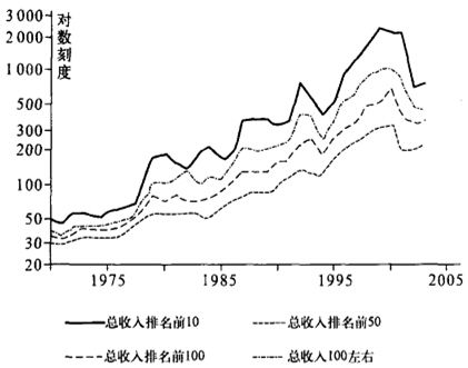 前三条曲线显示行政总裁们依据其薪资等级(第10、50、100)所得的上升。另一条曲线对应的是100位更高薪资的行政总裁的平均所得。注意,1000表示平均工资的1000倍。