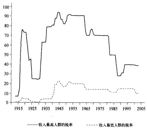 图1.7:上层阶级税收起义:美国收人最高与最低人群的税率,1913~2003