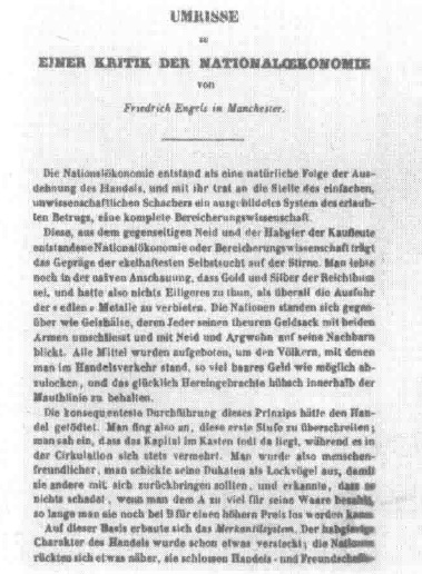 在他这篇文章的结尾,恩格斯宣布他有描述工厂制度的意图。他为此写了《英国工人阶级状况》,这本书于1845年初出版,对工业化在进入其最先进阶段所产生的社会影响做出了拓展性阐述。