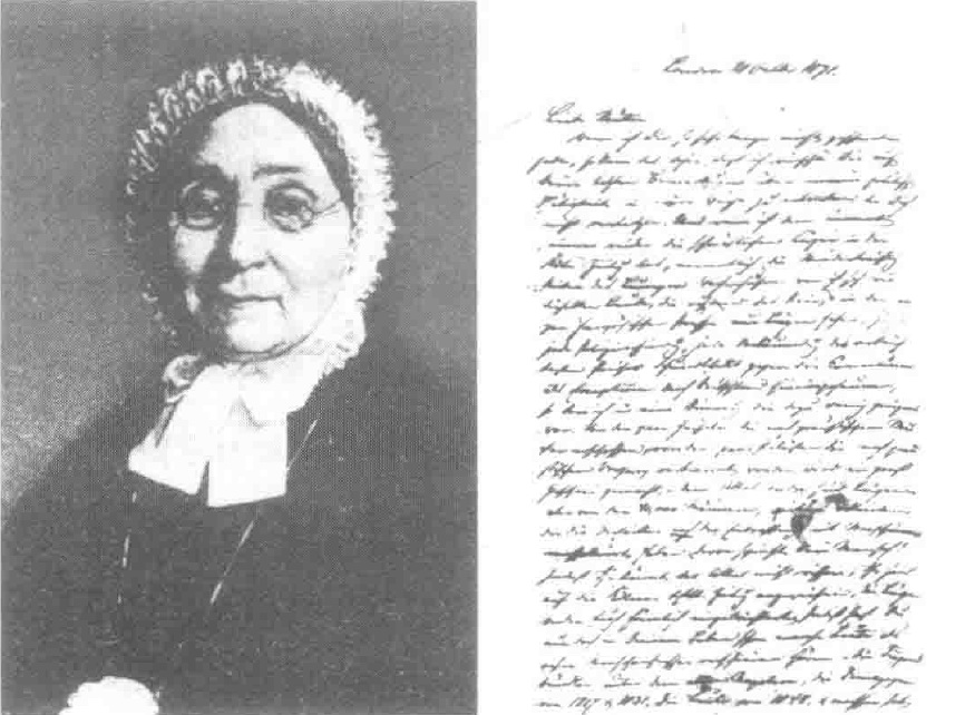 左图为恩格斯的母亲伊丽莎白·弗兰契斯卡·毛里齐娅·恩格斯,右图为恩格斯1871年写给母亲的信。