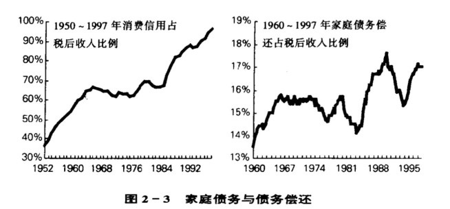 1997年底,美国家庭税后收入的17%(1万亿美元)用来还债,仅比1989年的17.4%低了一点儿(见图2-3,这是联储职员的估计,未正式公布)。这表明,收入的重新分配又大大前进了一步。如果不是利率突然下降的话,这部分债务的比例将会更大。但这段时期的贷款对消费者的需求也是一个很大的刺激。在1950年和1997年间,消费增长的23%来自于消费贷款的增长(不包括抵押)。在1991~1997年间这个数字为29%,高于二战后的任何扩张时期[8]