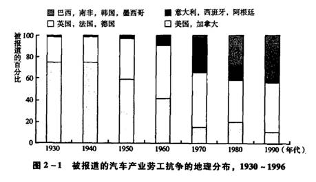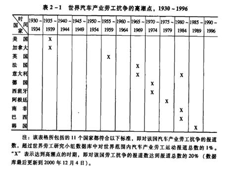 在这些国家,汽车工人的战斗性成为一种显著的社会现象——表2-1再次印证了汽车工人运动的战斗性在空间上发生连续转移的这一图景。