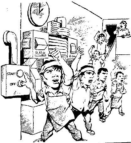此是由工人们所实施最高形式的军事化大规模行动,是为了达成他们的需求,并在工厂能力所及的范围内,解决他们的经济问题。罢工能使生产瘫痪,而强迫资本家屈服于工人的要求。罢工有二种类型一即工厂罢工及一般罢工*。