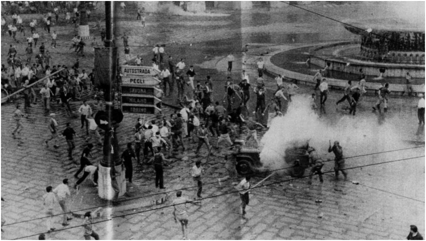 我感觉肯定会和警察起冲突,当看到他们在广场中间列队,还把街道的出口封锁时,我们的队伍乱了,但在他们顶上来之后,我们的队伍又凑了起来,集结在门戈尼路和集市路的门廊下。当时的警察没有多先进的装备。不像现在的催泪弹,他们把啤酒罐一样的东西扔过来,然后在地上滚。人们用手帕保护脸,不被气体伤到,也会抓住它们往前扔,这些罐子还不像后来的催泪弹一样会烫伤手。警察还没有盾牌,警棍比现在的要短得多。他们担心受到攻击,因为布雷达(Breda)和法尔克(Falck)公司的工人在遇到紧急情况时,一般会带头盔和工作手套上街。他们的武器也是过时的。他们把卡尔卡诺91-38式步枪当做警棍来使用。但他们更喜欢从卡车上发起进攻。他们常常失去理智开枪,这就是为什么,那些年里发生了如此多的谋杀。无论如何,在阿迪佐内事件的那一天,我们被警察扣留了三四个小时。乔万尼·阿迪佐内被一辆开进人群队伍的卡车撞死了。在最初的冲突之后,警察不再下车,因为只要下车就会被人拿棍子一顿好打。他们全速开车,让别人抓着腰,从车上挥动警棍,打中了人们的牙和脑袋。人们抄起没有杀伤力的管子(就堆放在广场上)来回应,当卡车开来时,两三个人就拿它对准驾驶员,如果卡车翻倒了——当时翻过不少——我们就跳上车揍车上人员。在某一刻,上了岁数的共产党员想停下这场冲突,但我们不同意,一直坚持到晚上,从帕多瓦军营开来了我们没法对付的大卡车。除了阿迪佐内死了,还有很多人受伤,然后晚上我们把门戈尼路的名字贴上了,改成“被警察杀死的乔万尼·阿迪佐内路”。但共产党不想让这起谋杀案成为风波。当时是中左翼在执政,共产党希望在新政治格局中分得一杯羹。在这起事件中,法官认定阿迪佐内死于逃跑人群引发的意外,党也接受了这个说法。年底我就离开了党。