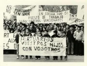 1979年,民主联合会[8]赢得大选。苏亚雷斯[9]领导的政府(1979至1981年)经历着内部分裂。它不顾工人利益受损,打算开展工业改造计划。为了争取有利于工人的协议,巴港工人组织和协调组织在巴塞罗那进行了艰苦的斗争。为此,码头工人全体大会通过了先前在各个港口讨论的一系列基本要求,这将是这一行业的第一份集体协议。全国货运公司联合会[10]的雇主们的回应是,他们不接受与非法工会进行谈判,因此不接受与协调组织进行谈判,此外,他们也不接受集体协议,只允许每个港口各自提出单独的条件。