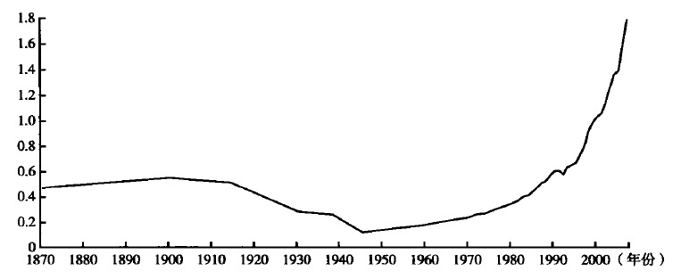 有许多方法来衡量这一领域的全球化,包括资金的流动或者通过企业外迁或国际代加工来计算生产的流量。在所有可能用来衡量的指标中,海外总资产与全球国内生产总值之间的比值这一指标能对这种形式的全球化作出一种很有说服力的历史分期(见图7 -2): 到20 世纪初之前该指标一直增长缓慢,到介于两次世界大战之间这一时期出现收缩,而“辉煌三十年”期间重拾升势,到了新自由主义阶段则呈现几何组增长。它与过去时期相比出现了十分明显的突破:全球化的性质发生了变化。