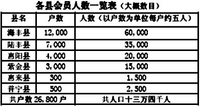 此时农会并发出有宣言(须待查检)及农会利益(须带查检),兼之无论何日何夜,我们必到乡村去宣传。到了十月份,加入农会会员每日平均有二十人了。由赤山约而平岗约,银镇约、青湖约、河口约、西河约、公平约、旧墟约……十余约,都成立了约农会,把县城东西南北都包围起来了。这个时候,我们就筹备海丰县总农会。 这个时候,农会就发起组织了一个济丧会,由会员自由加入,约百五十余人,无论那个会员的父母或自己死了,由各会员挪出两毫钱来济丧。此方法宣布后,第一日即有某会员的父亲死了,各会员挪出两毫钱,共约三十余元,同时会友并往致祭,行送丧的礼节,农民益加欢喜。到了第五日,又有会员的父亲死了,这个时候,济丧会的会友无法负担,乃先由农会代出,另日由济丧会筹还。到了第七日,又有一个会员死了,再由农会代出三十元。这个时候,济丧会会员吓了一惊,成立未十天而死者五六人,倘继续下去,如何办法呢?乃开全体会员大会,宣告临时停办,俟农会财政充裕时,始继续办理。 又办了一间农民医药房,在海丰大街,由一热心农民运动之西医生某君担任医生,凡农会会员有病须药者,准由该会员执会员证到来领药,药价仅收一半,非会员则全收。请诊症者如遇会员,不取诊费。并由该西医之老婆担任接生,凡遇会员不收接生费,仅取药费一半,大约二三角钱。自是领药接生者甚众。甚至有非会员而借会员证去领药者亦有之,乃在会员证中加数条规则以限制非会员借用,并规定会员证失落补领费二毫。 到了民国十二年,新历一月一日,乃海丰总农会成立大会,此时加入会员已达二万家户,以农会管辖下之人口计,有十万人[6],以全县人口比较,占全县人口四分之一。是日各乡代表到者共六十余人。开会秩序:(一)主席宣布开会理由,(二)各代表报告,(三)主席报告筹备经过,(四)演说,(五)选举,(六)讨论章程,(七)提议,(八)欢宴。结果选出彭湃为正会长,杨其珊为副会长,蓝镜清为财政,林沛为庶务,张妈安为调查……(其余忘记)。总农会之组织图表如下: