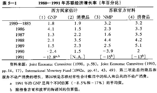 表5—1提供了苏联经济总产品和总消费增长率的资料,包括西方国家估算的结果(第一项和第二项)和苏联官方统计的结果(第三项和第四项)。