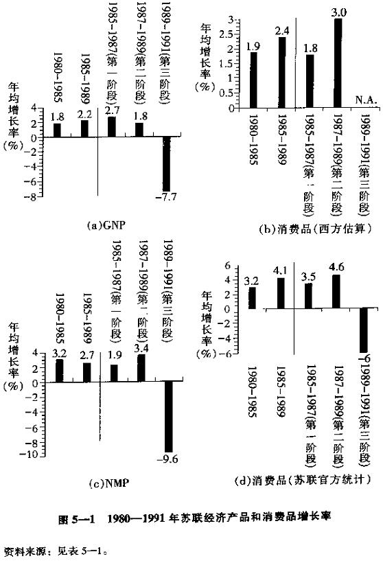 从表5—1和图5—1可以看出重要的两点。第一,它们表明了苏联经济在1985年至1989年即改革的前两个阶段仍继续扩张,只是在1990—1991年,当第三阶段社会主义体制瓦解的影响被感觉到了的时候,经济才开始紧缩。图5—1表明整个苏联的经济在1985年至1989年的每年都出现了正增长。1990年的总产品,不管是用GNP(见图5—1的第一栏)还是用NMP(图5—1的第三栏)来衡量,都有轻微的紧缩。在1991年,经济进入了一个从任何角度来看都严重萧条的时期。如图5—1(a)所表明的,用西方的GNP衡量,苏联经济在改革的前两个阶段(1985—1989年)实际上比改革前五年的GNP增长更快。用苏联的物质生产净产值来衡量,如图5—1(c))所示,苏联经济在1985年至1989年间依然持续增长,尽管其速度比80年代的前五年要慢。