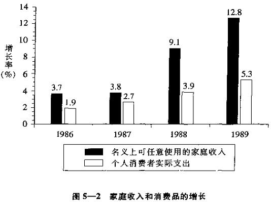 [11] 图5—2的数据可能低估了家庭收入和可得到的消费品差距的增加。从下列现象可以看出这点:当消费品储备在仓库中开始减少时(如1987年至1989年那样〉,而消费者个人实际支出增长就有点超过消费者可得到的商品的增长了。