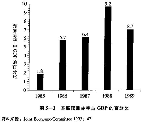 消费品短缺恶化背后的另一个因素是政府预算赤字的增长,这是由于1987年的改革导致了税收下降的结果。图5—3是苏联国内生产总值(GDP)预算赤字的百分比数据。[13]在1985年以前,苏联的预算赤字是可以忽略不计的。在1986—1987年,当反酗酒运动大大减少国家酒类销售的收入时,突然出现了巨大的预算赤字。1988年和1989年,《国有企业法》的生效使预算赤字变得更大了。[14]当国家职工工资部分由印刷新货币来解决时,消费品的过度需求问题就变得加复杂了。[15]