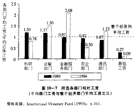 某些工薪阶层的人比处于休克疗法政策之下的另外一些人过得好些。图10—7显示了在1989年1994年经历了不平常的变化——上涨或下跌——的经济部门中,其工资相对于整个经济中的平均工资的言的变化情况。1989年科学家的工资高出整个经济中平均工资的20%,到1994年,其相对工资下降了1/3,而同期服务于金融部门的雇员的工资相对于平均水平翻了一番。现在俄罗斯有才干的年轻人梦想成为银行家,而不是科学家,科学家们的低工资难以满足他们最起码的生活需要。以前农业工人的工资水平刚好低于平均水平,而现在只有平均工资的一半。相对于平均工资而言,最低工资线下降了2/3,表明最低收入工人的生活水平大幅度地下降了。
