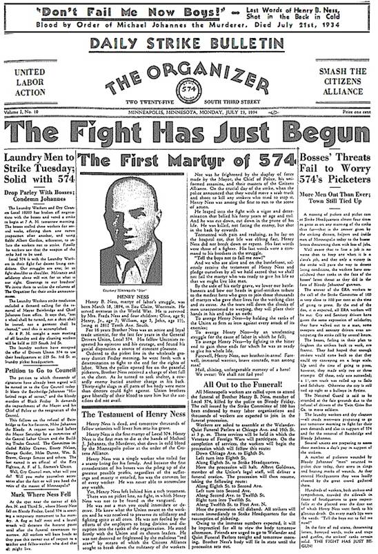 戈尔德曼讲完后,送葬队伍跟着灵车,继续前往十二街和城北第一大道的路口。街道两旁有成千上万的路人,他们大都脱下帽子,向574分会的烈士致敬。有些人没有脱帽,别人就帮他们拿下帽子。游行结束后,大批574分会的会员按照罢工委员会先前的指示,回到总部,继续执行纠察任务。剩下的好几千人坐着几百辆汽车,前往城北墓地。亨利在一战中曾出国作战,所以国外战争退伍军人协会(Veterans of Forein Wars)从斯内林堡(Fort Snelling)调了一队联邦士兵,在墓地按照全套军礼给他下葬。参加送葬游行的,在罢工总部参加葬礼的,在墓地参加下葬的,加起来超过四万人。参加葬礼的有各行各业的工人,有参加了工会的工人,有还没参加工会的工人,还有几千名失业工人。