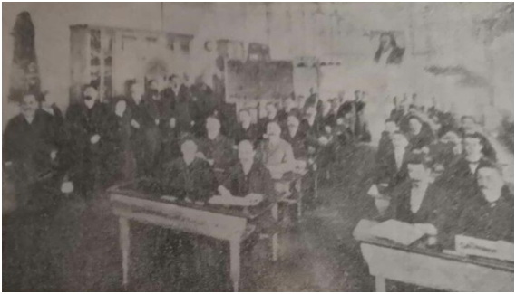 左边第二排椅上第一人为皮克,左边站立者第四人是罗莎·卢森堡,第五人是贝贝尔(倍倍尔),第八人是梅林。