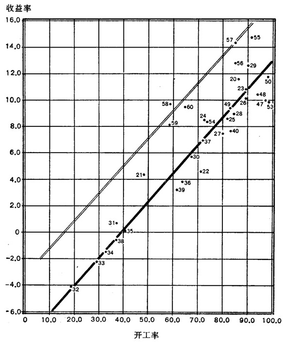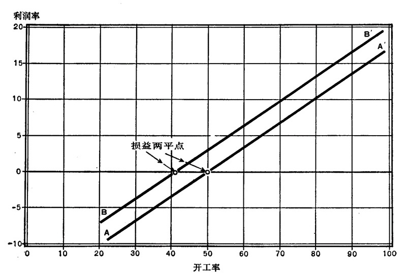在利润与开工率之间无疑具有密切的关系,后者的定义是实际生产与生产能力之比。如果我们假定一个公司的生产能力是在一定的成本和价格之下提供最大限度利润的产量,那末,开工率的降低,不论是由于产量的减少或生产能力的增加或由于二者的某种结合,必然也造成利润的降低。而且,利润的降低比产量降低的比例还要大些,因此,在某种具体的产量上,利润将完全消失,这在商业用语中普通称为“损益两平点”(The“break—evenpoint”)——在这一点上,收入恰好补偿成本,既无利润,亦无亏损。利润之所以有这种表现,是由于存在着——这尤其是大公司的特色——管理费用,它不随同产量一起变动。产量增加,分摊在单位产品上的管理费用就降低。如果价格保持同一,如果单位产品的可变成本在相应的范围内是不变的,那末,单位产品的利润将会增长,也象作为产值的一个份额的总利润一样。